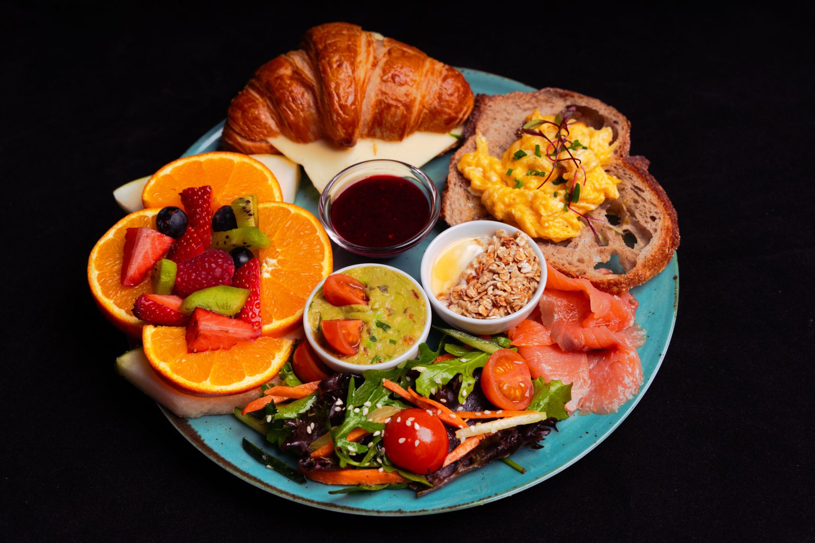 Sourdough bread, scrambled egg, croissant, guacamole, yogurt granola, jam, smoked salmon, cheese, fruit salad, iberian salad with cherry tomatoes.