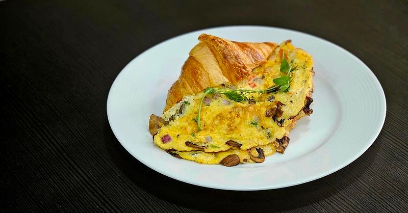 Homemade croissant with fried mushrooms & mozzarella omelet.