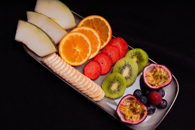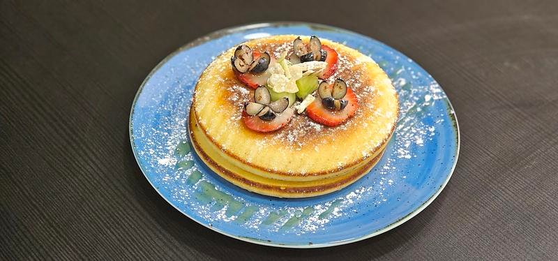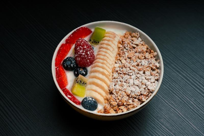 Greek yogurt, homemade granola with fresh seasonal fruits and banana garnish with sugar powder.