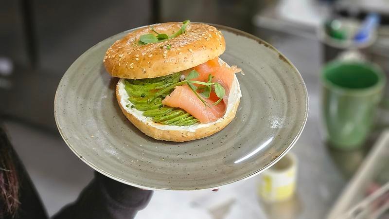 Toasted bagel with Butter, Cheese cream, Smoked salmon with freshly Slices avocaddo.