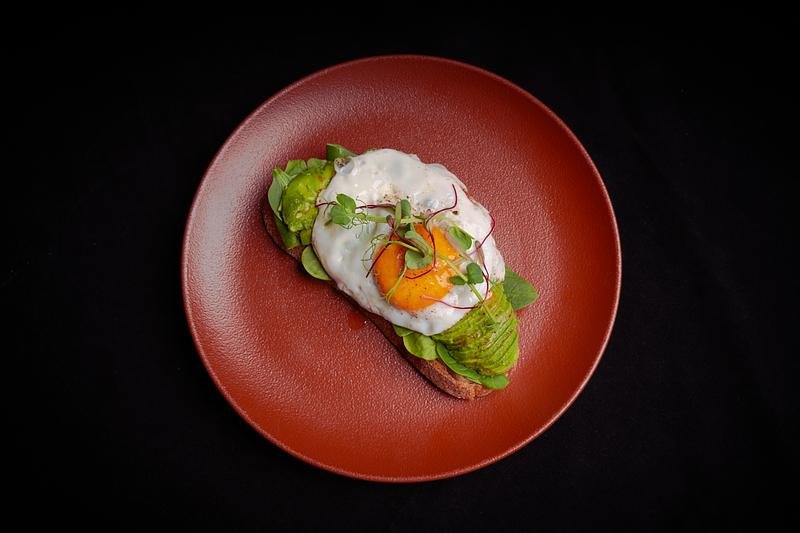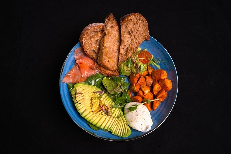 Toasted bread with Butter, marinated Spinach, Avocado, Guacamole, Smoked salmon, Sweet potatoes and Poached egg.