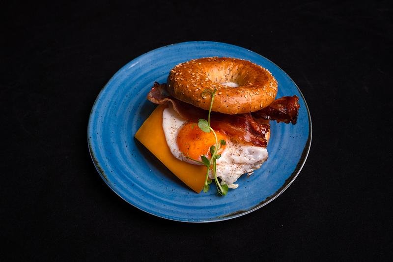 Toasted bagel with Butter, Fried egg, Cheddar cheese and Bacon.