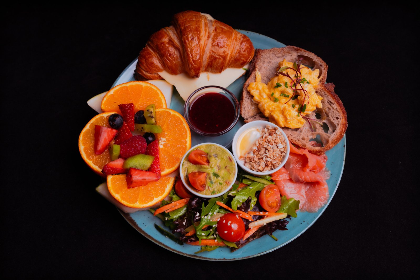 Sourdough bread, scrambled egg, croissant, guacamole, yogurt granola, jam, smoked salmon, cheese, fruit salad, iberian salad with cherry tomatoes.