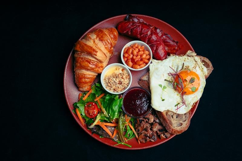Toasted bread, croissant, iberian salad, fried mushrooms, greek yogurt, jam, baked beans, sausage, bacon and fried egg.