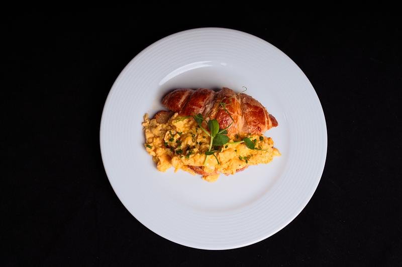 Homemade croissant with scrambled eggs. EXT : BACON - 2.2€ : SAUSAGE - 3.2€ : SALMON - 3.2€