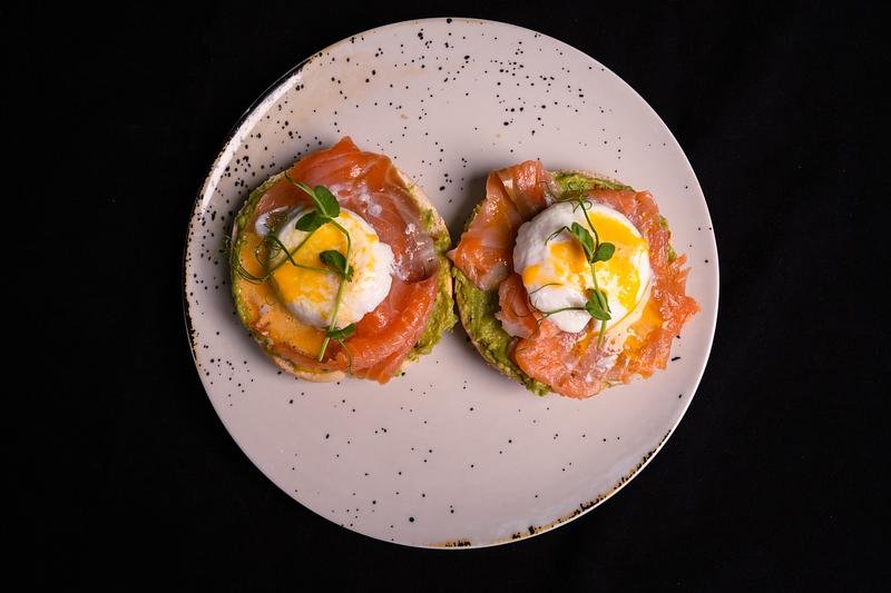 Bun with Guacamole, Smoked Salmon & Poached egg with Hollandaise sauce.