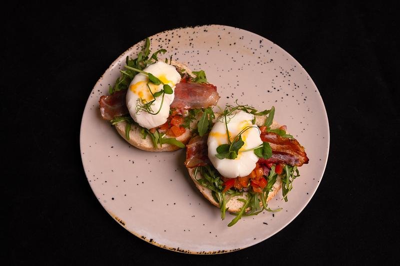 Bun, Rucula, Homemade Tomato salsa, Bacon & Poached eggs with Hollandaise sauce and fried onions.
