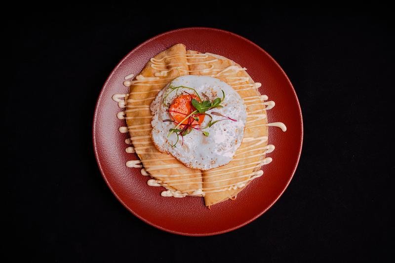 Tortilla, eggs, bacon, baked beans, fried mushrooms, grated mozzarella, mayonnaise and fried egg on top. EXT : SAUSAGE - 3.2€ : SALMON - 3.2€