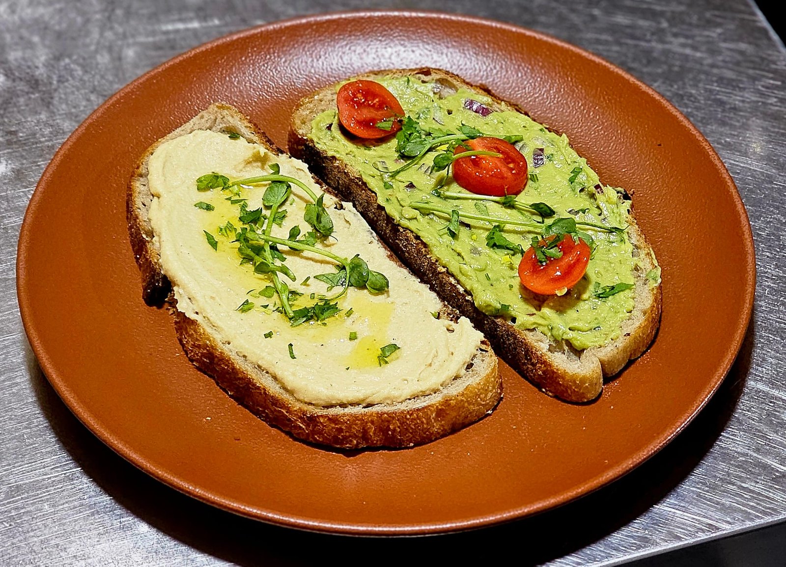 Sourdough, lightly toasted and generously spread with silky chickpea hummus and fresh avocado guacamole, accented with ripe cherry tomatoes and finished with a drizzle of extra-virgin olive oil.