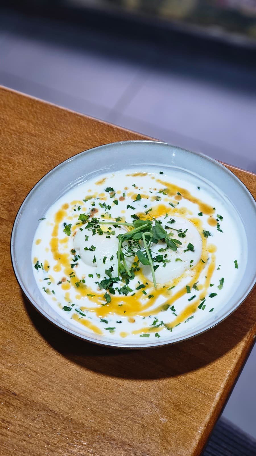 Soft-poached eggs layered on creamy garlic yogurt, drizzled with aromatic chili butter and olive oil, and topped with fresh herbs. Rich, comforting, and lightly spiced — a beloved Turkish breakfast classic, served with warm bread for dipping.
