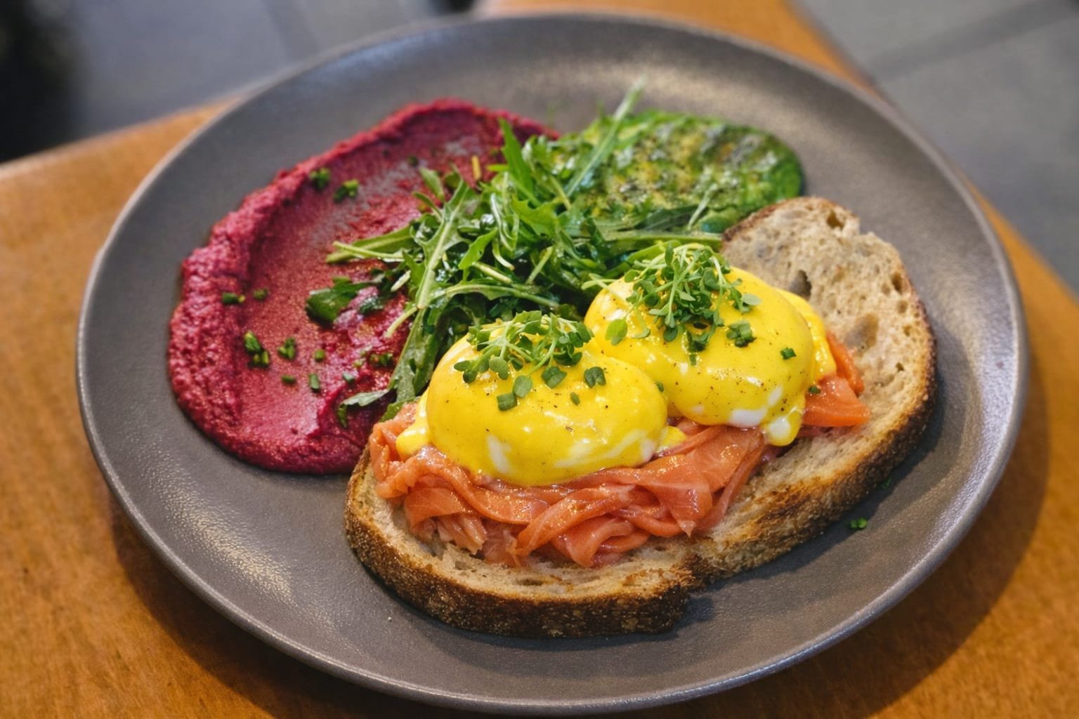 Toasted sourdough layered with smoked salmon and two poached eggs, served with avocado, fresh rocket salad, and our house beetroot hummus.